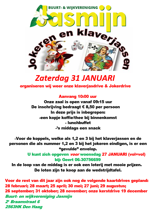 - Klaverjas- & Jokerdrive zaterdag 31 januari